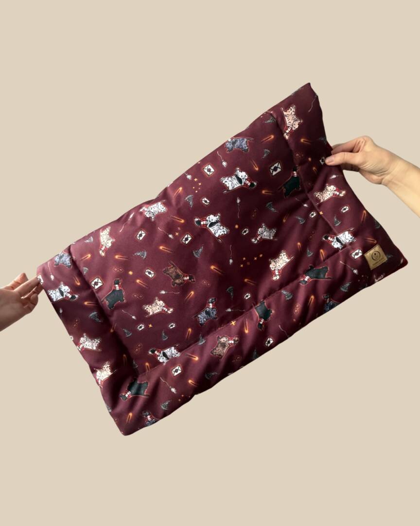 Mata podróżna jest szyta ręcznie na zamówienie z obiciowego materiału, który spokojnie można prać w pralce. Jest miękka i wygodna, a kompaktowy rozmiar pozwala ją zabrać wszędzie. Niczego więcej Twojemu przyjacielowi nie trzeba – no może poza okazjonalnym podrapaniem za uszkiem.